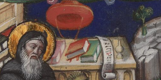 An illumination in a 15th-century (?) Vatican manuscript digitized in the past week, Vat.lat.2277, gives Jerome the full hat treatment, plus a messy desk covered with his codices and scrolls to translate the Bible into Latin, a fanciful 5th century Holy Land scene outside and a golden halo: