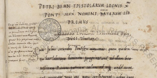 - Vat.lat.3364, a book of draft papal letters scribed (and full of scratchings and amendments) by papal secretary Pietro Bembo: Epistulae nomine Leonis X scriptae (letters written for Leo X), When this was shown in the Rome Reborn exhibition, Anthony Grafton noted: "Bembo's autograph letters ... provide a good sample of "chancery italic," a script developed by Roman humanists in the late fifteenth century from the humanist cursive minuscule invented by the Florentine humanist Niccolo Niccoli in the 1420s." Today's lovely typeface Bembo is named after Pietro, but not because of his handwriting. Rather, the typographers' inspiration was a book of Pietro Bembo's verse in a font cut in 1495 by Francesco Griffo for Venetian printer Aldus Manutius.